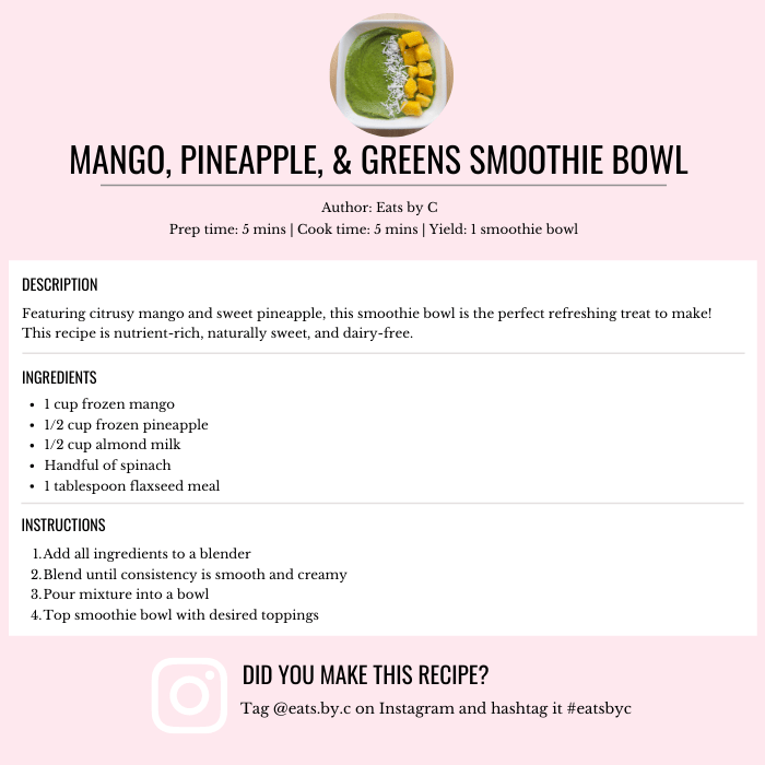 Featuring citrusy mango and sweet pineapple, this smoothie bowl is the perfect refreshing treat to make! This recipe is nutrient-rich, naturally sweet, and dairy-free.