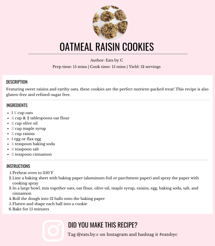 Featuring sweet raisins and earthy oats, these cookies are the perfect nutrient-packed treat! This recipe is also gluten-free and refined-sugar free.