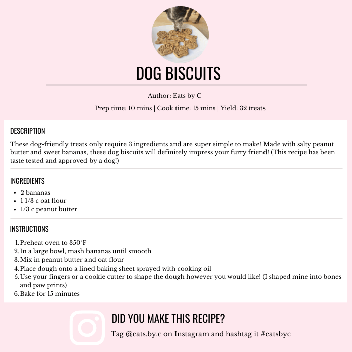 These dog-friendly treats only require 3 ingredients and are super simple to make! Made with salty peanut butter and sweet bananas, these dog biscuits will definitely impress your furry friend! (This recipe has been taste tested and approved by a dog!)