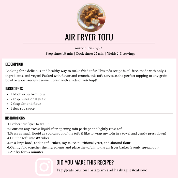 Here is a short list/guide for finding the best air fryer and tofu to make this recipe! If you’re new to air fryers and unsure if buying one is worth it, I highly recommend purchasing one! The amount of delicious and fun recipes you can make with an air fryer is endless, from onion rings to crispy tofu to any other food you are craving!